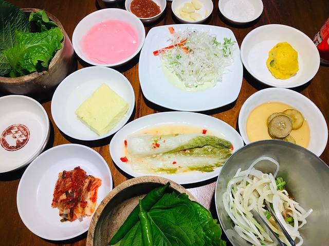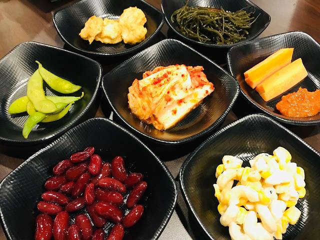 赠送的小菜,随意添加,黄色的南瓜泥最好吃😋。葱丝调料是蘸肉的,被我拿来腌制生肉了。店里韩国大妈看见以后,恨铁不成钢似的赶紧把肉抢了出来,一副我在暴殄天物的样子