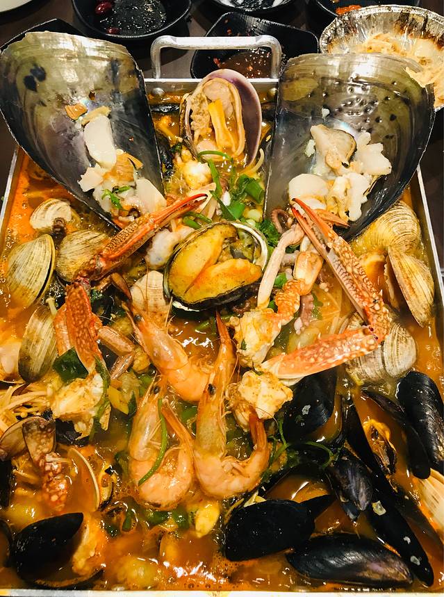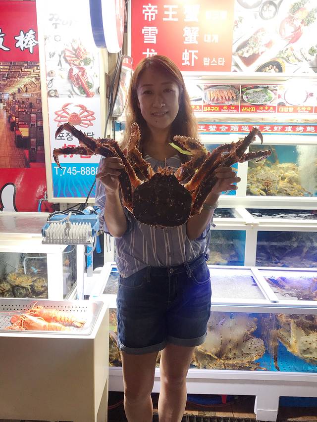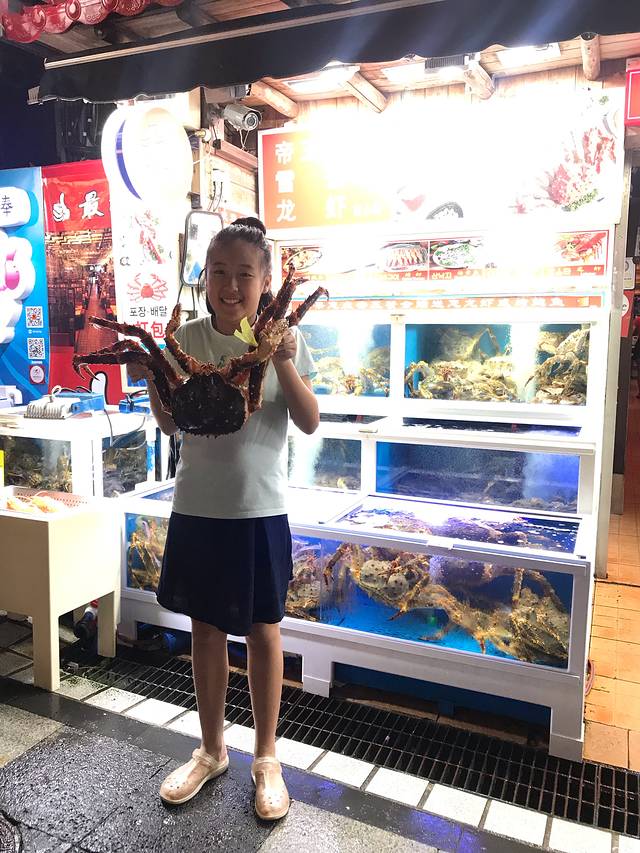 水族馆种下的惦念啊!商量吃食的时候一致决定再吃一回帝王蟹。酒店对面就是保健路,并列两家帝王蟹店,一家叫满满,一家叫最棒。其实最开始我们去的是满满,店员是中国小妹,很有礼貌一直在给我们介绍。韩国老板却很生硬,都到了称蟹环节了,非要给我们一只6斤的大蟹,完全没有商量的余地。于是我们直接放弃了,掉头来到最棒家。买帝王蟹送波士顿龙虾、烤鲍鱼、烤虾、鲍鱼粥等。中国小妹很 nice地给我们找了一只四斤多的蟹,不仅按四斤计费,还把送的鲍鱼啦、鲍鱼粥啦直接从两只变到四只,老板也一直笑眯眯地,给大家拍照留念。这样多好,在可替代性这么强的竞争下,有什么理由要客人来看老板的脸色呢?