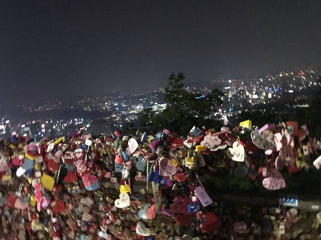 从游乐园出来已经天黑了,决定直接打车到首尔塔去看夜景。其实头一天我们已经打车去了首尔塔,但是拜司机所赐,我们围着首尔塔前后左右转了快一个小时,司机也没有找到正确的路,最终司机又把我们送回了酒店。今天再不去的话,感觉还是有些遗憾,所以准备去看看夜景。