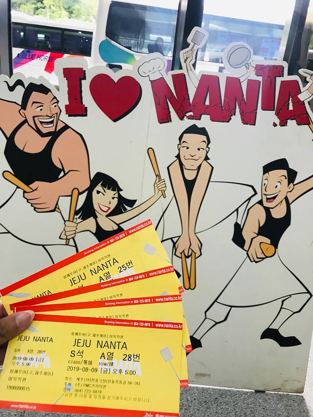 乱打秀、涂鸦秀和真人秀,被称为韩国三秀,在首尔也有剧场。济州剧场距离酒店7公里,订票时发现可以选择往返班车服务,在预定备注中注明就可以了,还是蛮方便的。乱打秀的班车就在新罗免税店对面的格兰迪酒店停车场,上面写着NANTA的字样,上车发现一车都是中国人。