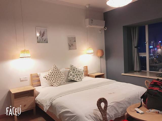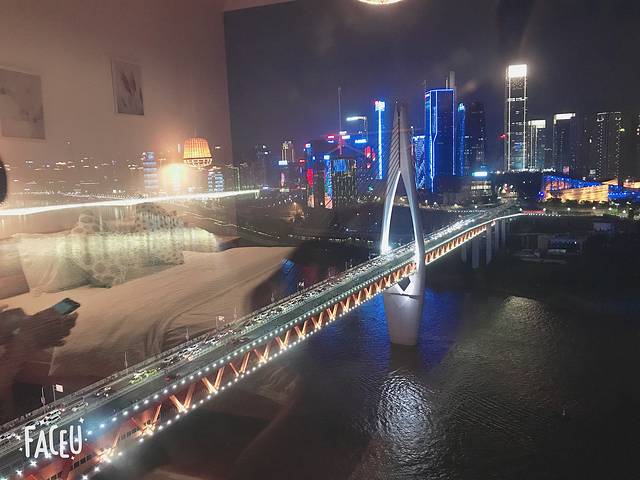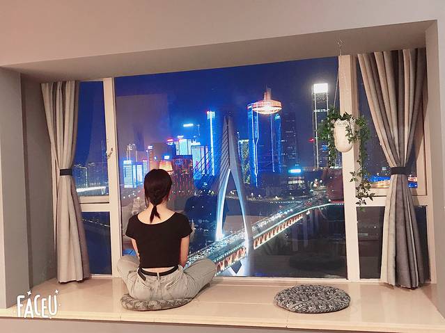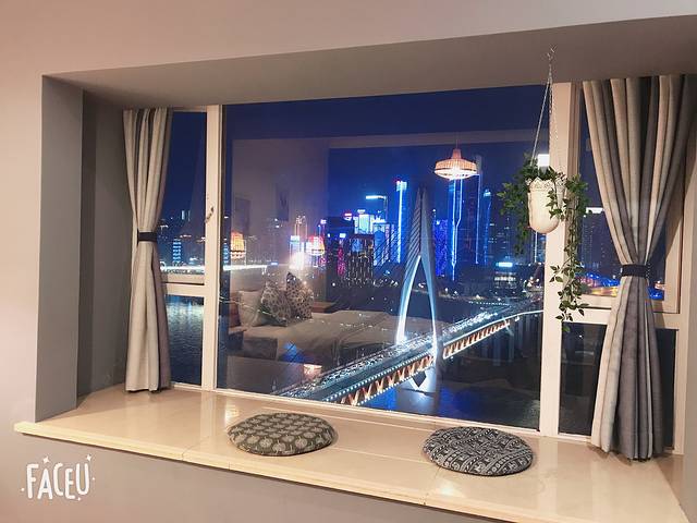 光这个飘窗+夜景就欢喜了十几分钟,可以直接看到千厮门大桥以及下面游轮,对岸还可以看到巨大荧屏。总之这个民俗满分,超级值得!!推荐!