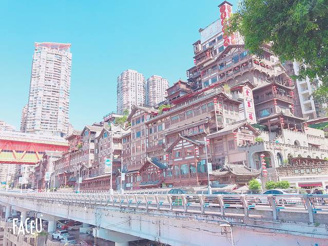 1. 洪崖洞景区正大门的马路对面,靠近江的地方有一个平台,那里可以拍到我的封面图片。