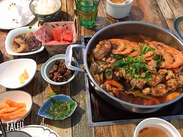 好在这家味道很不错,用了团购这一锅才75,虾🦐鱼鸡肉,下面有土豆、地瓜、胡萝卜、木耳,配有宽面条和娃娃菜,另外配有小碟小菜,以及银耳汤自助,感觉非常值得,还有配他们的宽苗条,味道很好呀!推荐~