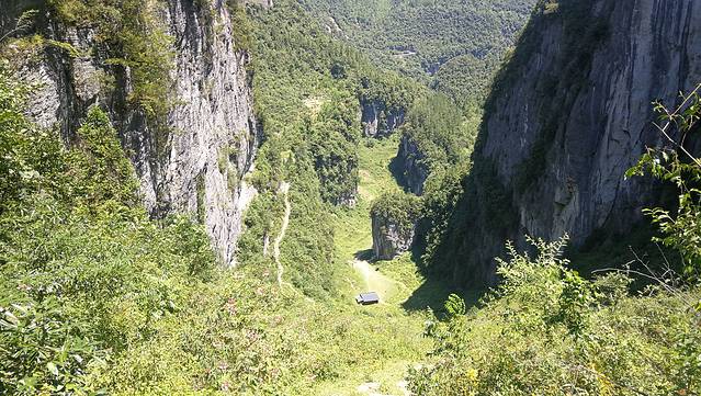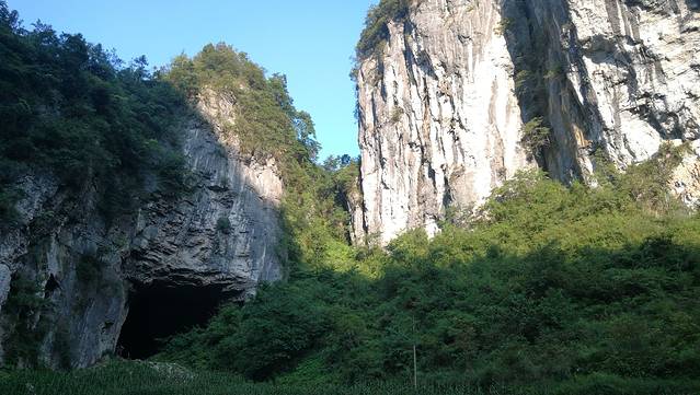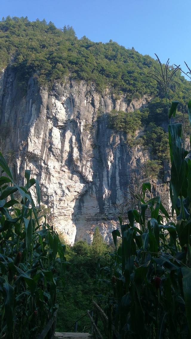 在去三龙门出口的这条小路上,需要穿过一大片玉米地。本来你在里面除了路什么都看不见,猛然一个转弯,一副全画幅的悬崖照铺满你的视觉范围,真的被震撼到了!到了三龙门出口,再爬一小段路,就到了这个我下次再来的理由:银河洞。