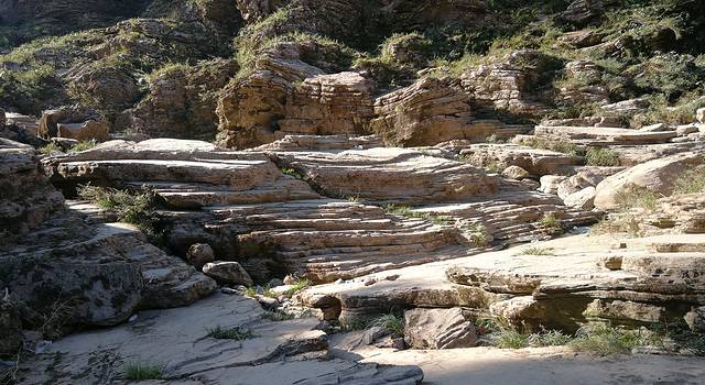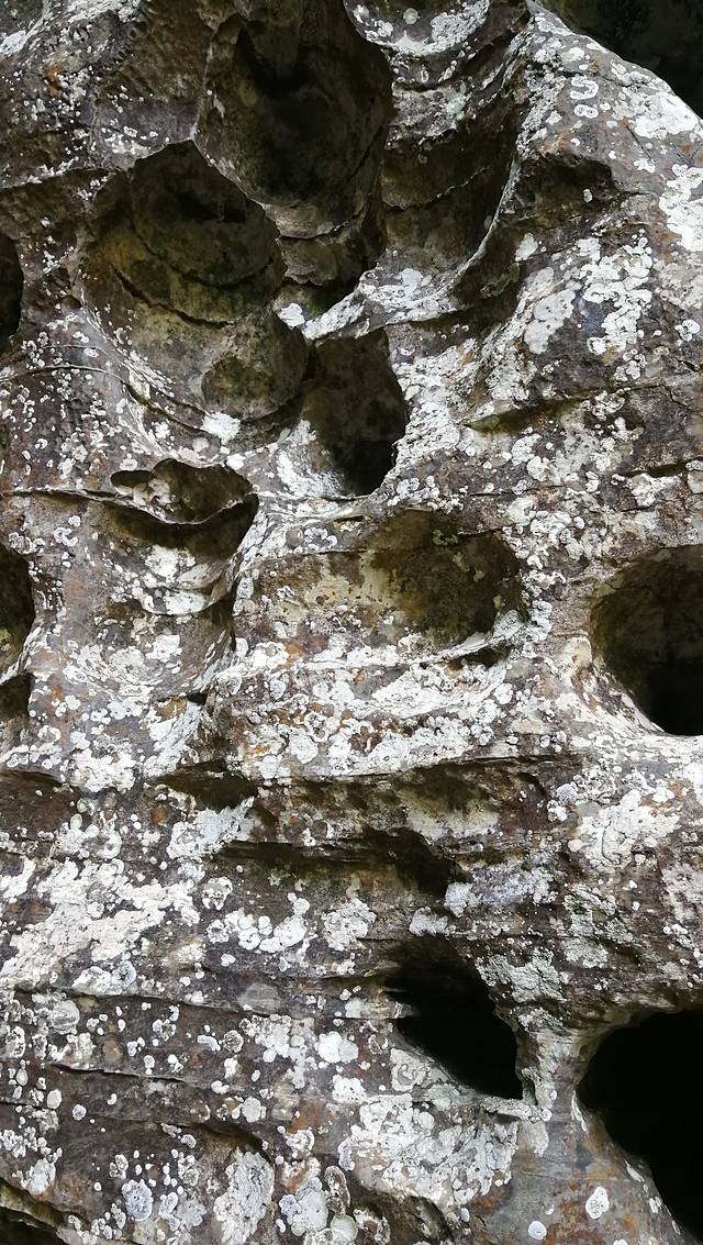 银河洞这里,也是古河床这一段的起点。古河床的这些断岩和大石头,就是这个徒步路线的第二个难点了,很多地方都需要手脚并用的爬,最难得是有时候你还找不到爬的路。我就因为错过了一个红丝带,在一个差不多三米的地方被困住了,实在没有下去的路,最后没办法,先把背包扔下去,然后手巴在石头上跳下去的。