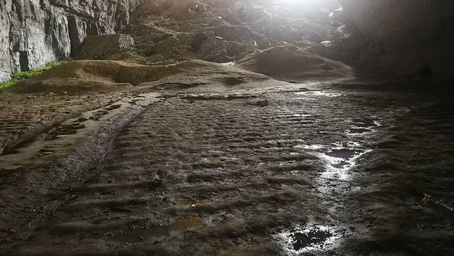 过了竹林,有条路是通往腾龙洞后洞,进洞以后伸手不见五指,打手电走了大概两百米,发现有两个石门,进去石室检查了一下,都没有出路,就退出来了。后来听老板说,这个后洞原本是可以走到主洞去的,后来可能是因为危险,也怕人逃票,就给封了。