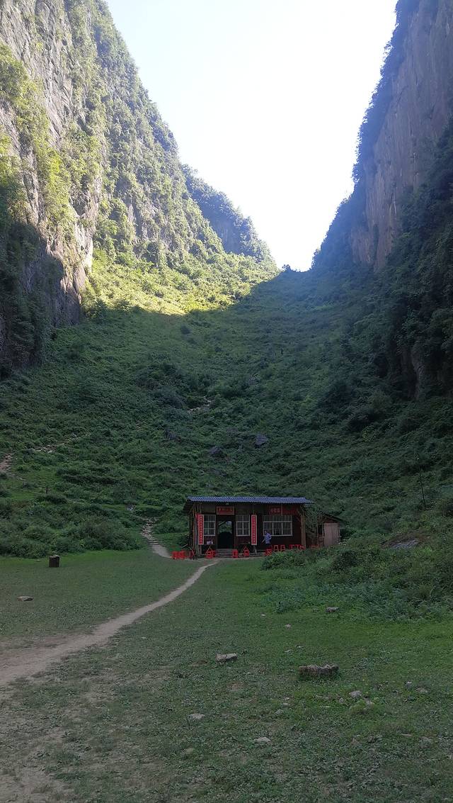 大概300到400米的古河床,“爬”了半个小时才走到头走,这是会从左边变出一条山路,顺着山路再走个一公里多,出现两户全木头结构的两层小楼,就有小卖部了,可以在这里修整一下。这里也有一个景点:深潭洞。顺着楼梯下去不久就可以走到。与之前的几个龙门不同,这里是进不去的,一波绿水挡住去路,伸向洞中,水是静止的,要是能有个小船,慢慢划着进洞看看,就像鬼吹灯里写的那样,就好了!