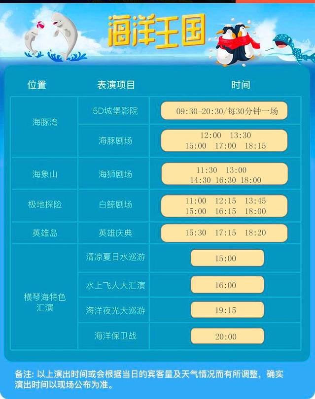 表演:5D影院 海豚剧场 白鲸剧场 海牛馆 鲸鲨馆 (60CM的亚克力玻璃制作而成)海狮馆 北极熊馆 水上飞人大汇演 烟花表演