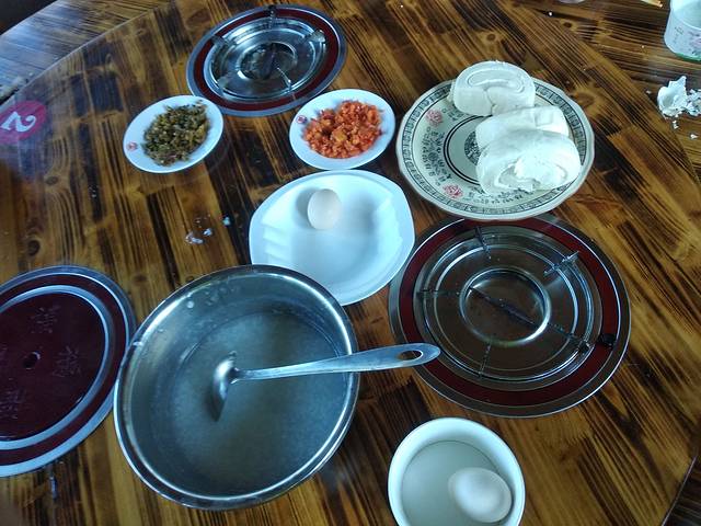 黑店的过早,10块钱一个人,不管饱。我们因为只有那一家卖吃的,所以我们在他们家一个人多买了一个鸡蛋,带上了两个馒头,一碗炕土豆出发。