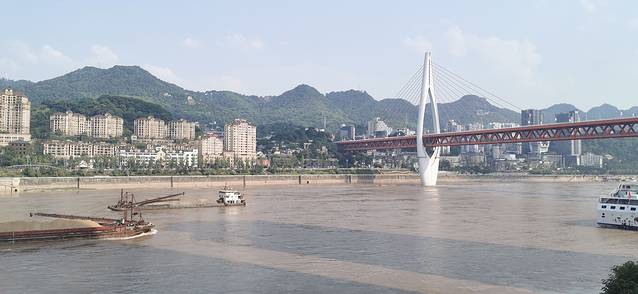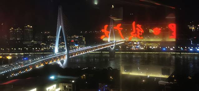 九码头下车位置,就在这个标志性桥下面。江水湍急,一桥飞架南北,上层行汽车,下层行轻轨,设计现代独特,外观雄伟壮观。