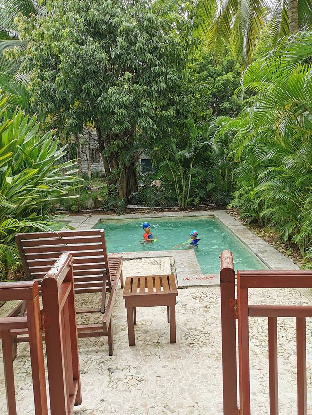 小盆友们最爱的海边,所以第二天自然醒后直接转到亚龙湾华宇度假酒店,五百多的池畔房有一个私人泳池,楼栋外又有一个曲型泳池,酒店生意很好,我们十二点到酒店告知还要一个多小时才能入住,所以就寄存了行李先逛起百花谷,顺便去了海边,很近很方便,同时发现老外特别多,一圈逛完顺便吃了一顿午餐,一个茶餐厅两个美团套餐组合六个人才两百多,性价比很高,回来办好入住,小盆友又迫不及待的跳进小泳池了