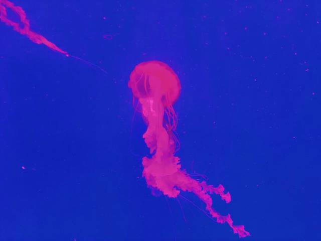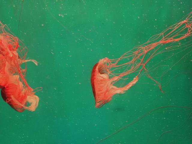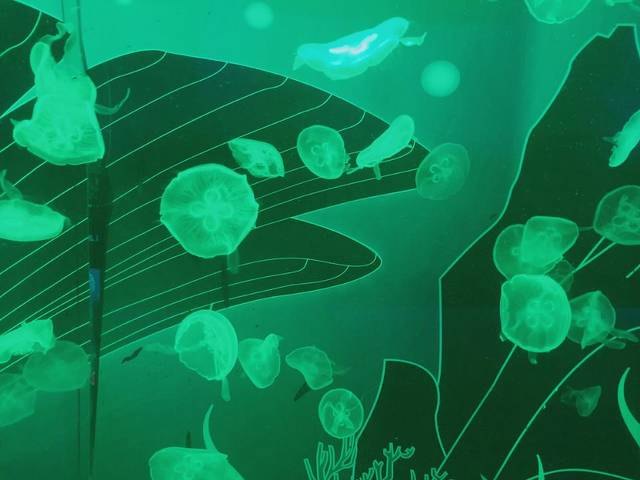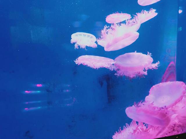 因为水母馆就在外面的一个单独空间,所以我们买了票第一站首先去了水母馆参观一番,各式各样的水母,在五颜六色的灯光下被照射的熠熠发光,呈现在我们眼前。看着他那柔软的身体慢慢的蠕动着,好想用手去摸一摸,不知道会是什么感觉,紧接着我们来到了水母实验馆,在这里可以看到不同生长周期的水母,还没成型的水母,不知道他们是经历过多少成长才长成我们眼前这一个个漂亮可爱的水母。