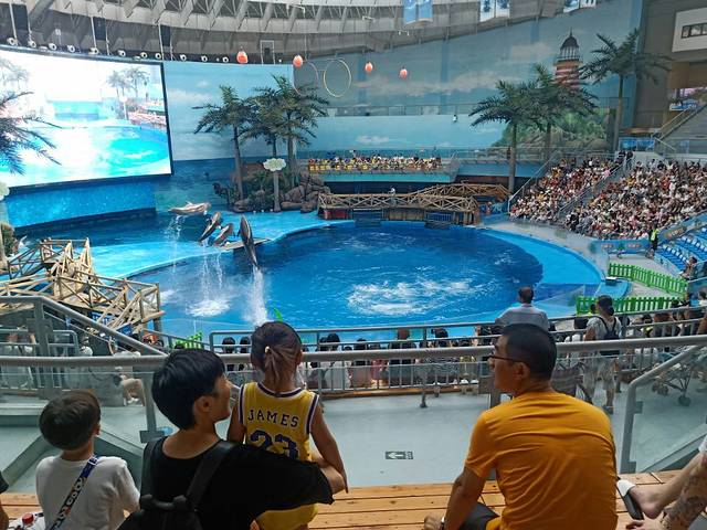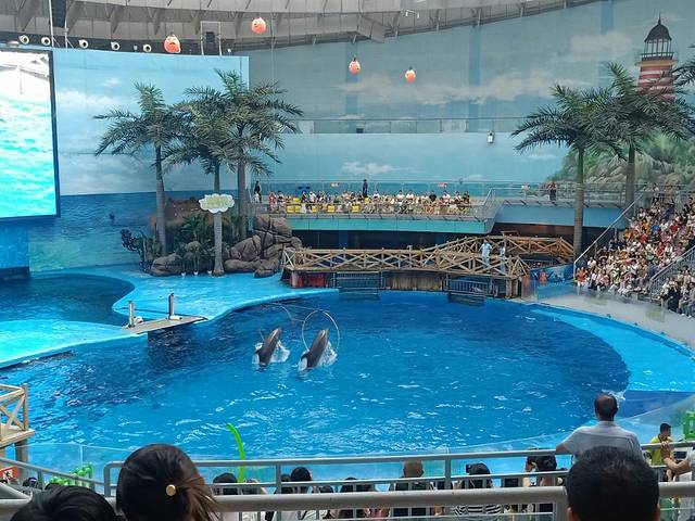 等到四点半的时候我们从这里上了三楼去看海豚梦想秀,在这个欢乐的天地,不仅能够一睹海豚等珍稀海洋哺乳动物的风采,更能欣赏到驯养员和海洋动物们共同带来的精彩瞬间:激情的空中跳跃、绚丽的水中翻腾、传说中的海豚音体验无限的震撼和愉悦,三个明星海豚和驯养员们的默契配合,观众与海豚的亲密互动,不是亲眼所见我都不敢相信还有这么聪明的动物,据主持人说他们的智商相当于一个两三岁孩子的智商。