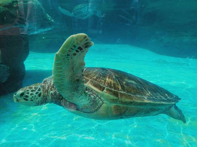 海龟馆,由热带植物环绕而成的休闲港湾,分为室内室外两个观赏区,看笨拙的大海龟轻姿曼舞,好象每颗细白的沙粒都显露着休闲的体态,慵懒的海龟慢悠悠的在水底游着。