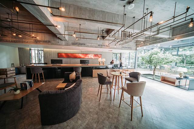 前台大厅里有绿植,工业风里有绿色的点缀显得有生机多了。