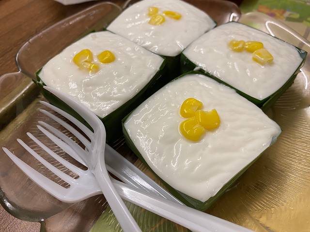 “椰汁大菜糕”咸甜口味的饭后甜品🍮上层椰汁🥥味道非常的浓郁!下层是大菜糕 (果冻质感透明状)里面还有玉米粒🌽 因为是咸甜味所以吃起来也不会腻