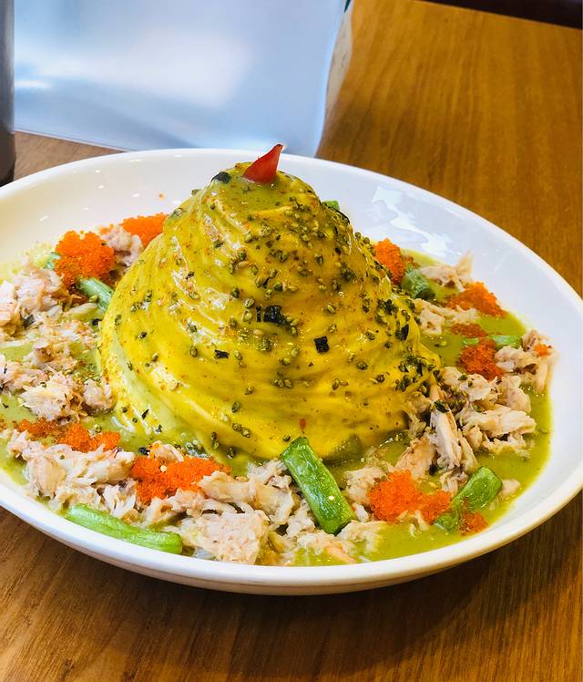 “蟹肉蛋包饭”我选的(东南亚青咖喱味)。能吃出是手拆蟹肉,搭配蟹子和四季豆,旋风蛋厚厚的,半熟、嫩滑、凝结的恰到好处。饭里面有木耳和胡萝卜丁不是简单的白饭。出品在意料之外的一家店。