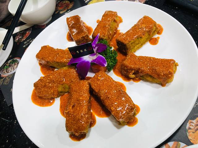 豆腐外皮炸的很焦脆,薄薄一层,里面是自家制黑豆腐,一块的分量就沉甸甸的。要趁热吃,口感最佳,凉了外面的乌鱼子汁就又些腥了,算是一道比较有特色的菜。