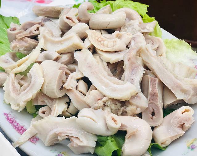 猪生肠~吃起来口感脆脆的,但是有一股淡淡的腥味儿 喜欢不喜欢的看个人口味吧~可以点来尝尝