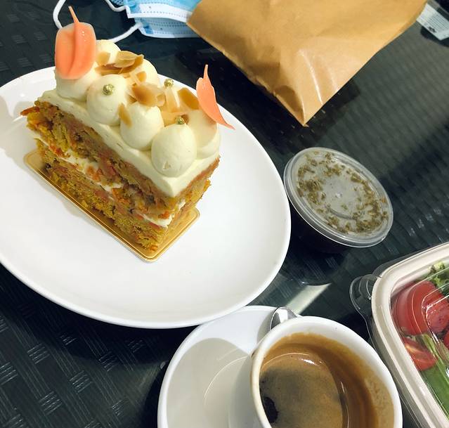 胡萝卜蛋糕🥕季节👀看到的。听起来就很健康哈哈哈~ 蛋糕底是比较厚重的那种有点磅蛋糕口感,里面满满的胡萝卜~ 上面是奶油奶酪那种酸奶油(就是红丝绒那种夹馅儿)