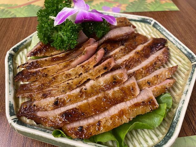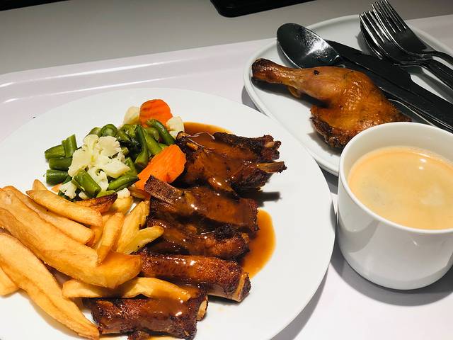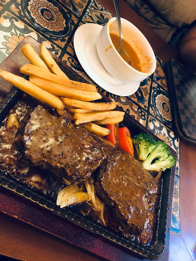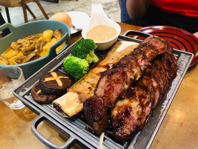 “烧加拿大牛肋骨” 肉是偏甜的口味,烧的5分熟左右,吃起来特别嫩,一口咬下去会冒汁水 ,上菜后铁板下的火🔥也会持续加热,喜欢偏熟的可以加热一阵儿在吃,一份的量还是比较大的,物有所值,它家也有甜品下午茶那些。开在凼仔,这个价位不算高。