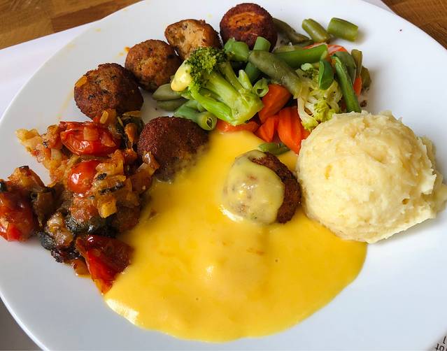 炸肉球和什么双拼,忘记名字了... 外皮炸的非常非常的酥脆(壳子是那种硬硬的,但是咬下去酥酥的),里面的肉应该是香肠打碎做得肉泥内馅儿,个人不喜欢吃炸物也觉得很好吃,他家的马介休看起来也不错,应该是那种鱼肉多余土豆泥的,下次打算试试~