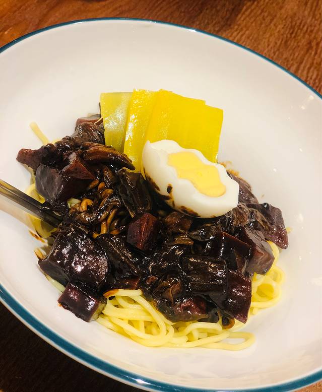 “炸酱面” 韩式炸酱面个人感觉这里做的微微有点偏咸了,配菜是土豆,黄色的是甜甜的腌萝卜。