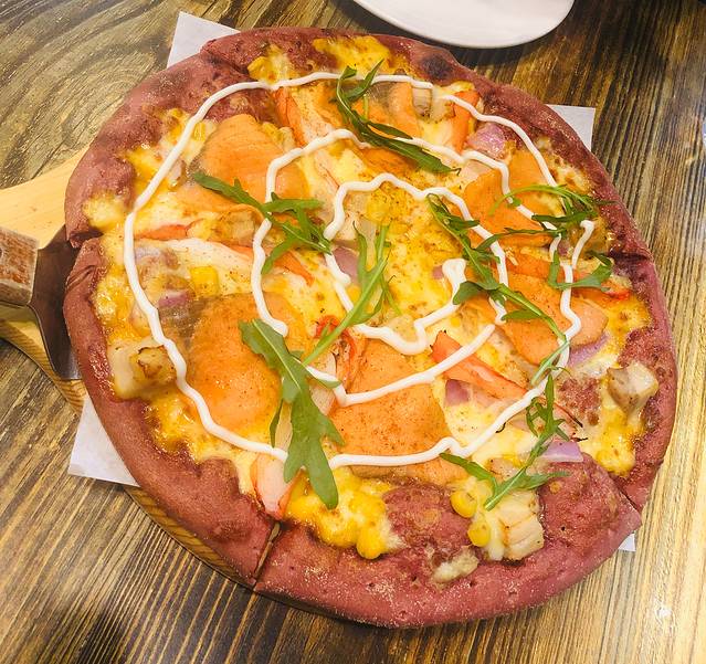 芥末三文鱼薄饼🍣 这个好像是春季限定,披萨上面是烟熏三文鱼和蟹腿肉,芥末味道不明显,是沙拉酱夹杂着芥末,饼底是紫薯🍠的,现点现烤整体很优秀👍