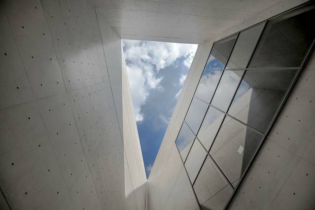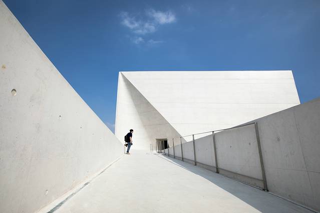 这里建筑外观呈长方形布局,以浅白色为基调,清水混凝土一次浇注成型。其实,艺术中心本身就是一件艺术品。