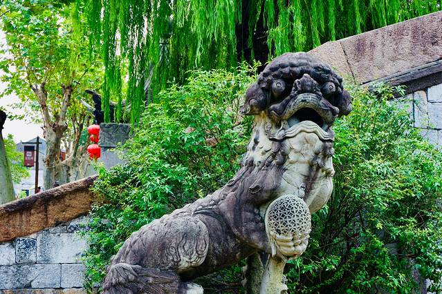 这一对青石狮子,是清光绪年间的产物,造型生动,刻工精细,与隔壁的石拱桥浑然一体,很特别。