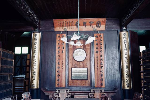 走进去就不能不感慨,这真的只是一个私家藏书楼吗?园林修饰的极好,走了好久才看到藏书楼的门面,九曲十八弯的园林道也是很用心了,而且湖边的太湖石也多是高价购入的,看来主人家对他的周边配饰也是极其用心。