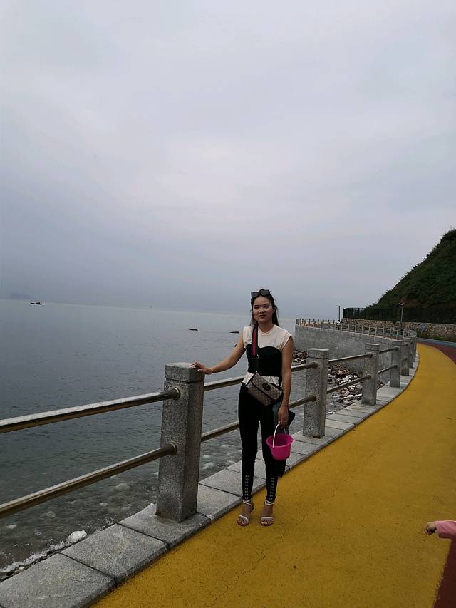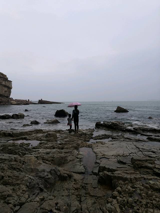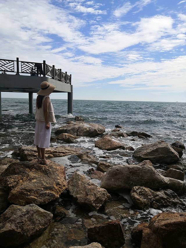 九丈崖是一大块礁石。顺着路走、越过海滩、爬上另一个阶梯,又是一番新景象。明耀的灯塔,突兀的标明方向。
