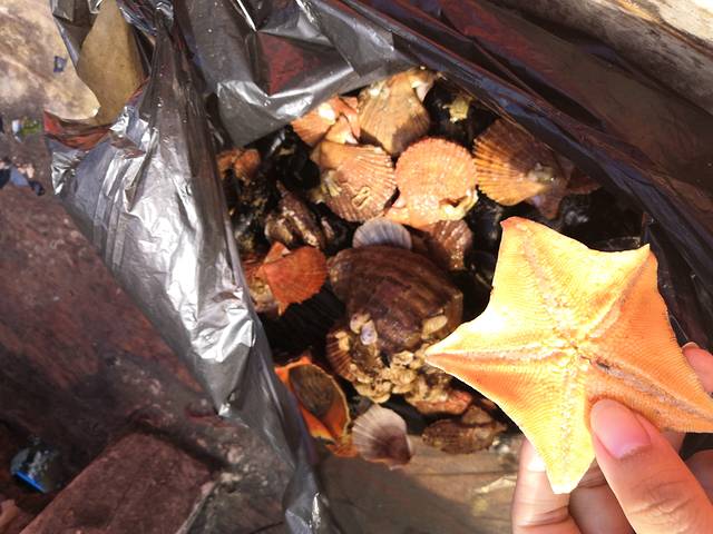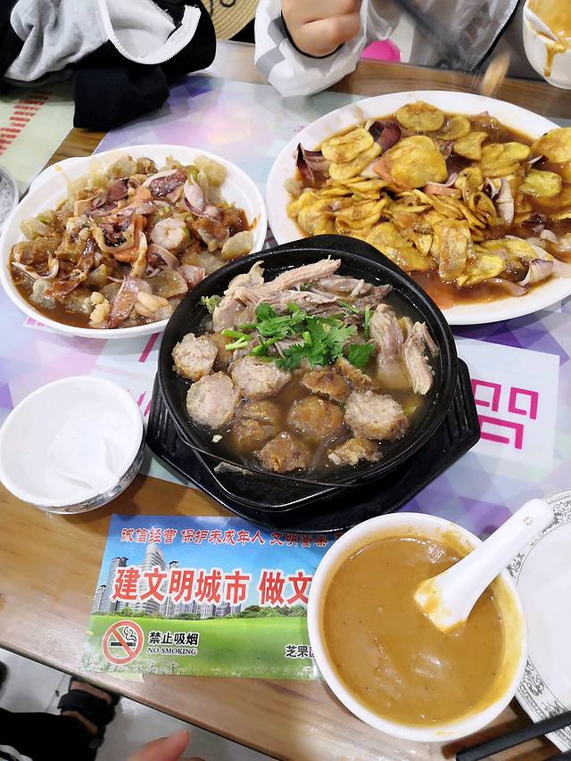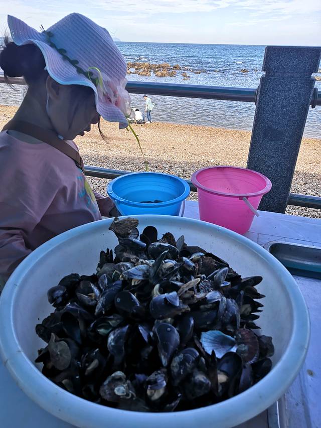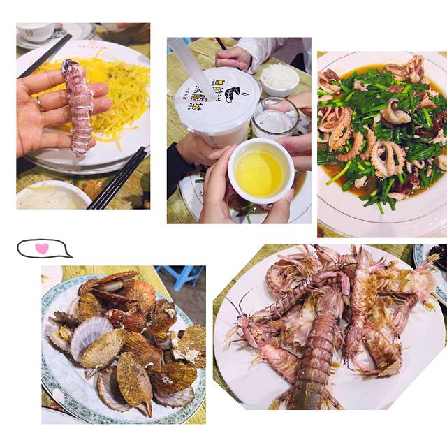 因为是淡季没有包吃,渔家推荐我们到周围的明珠广场去觅食。明珠广场吃饭的地方很多,我们选了一家人多的店。海鲜类多吃原汁原味的,蒸一下,配上醋碟就OK。皮皮虾55一斤,扇贝28一盘,其他也不算贵,点菜的话,菜量特别大!!