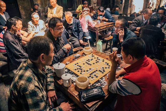 在这个茶馆里,每个人似乎都做着完全不相干的事,但无论你来这的目的是什么,都不突兀。拿着长枪短炮的摄影师拍着认真下棋和喝茶的老人,本地人依然悠闲自在地下着自己的围棋,游人喝着茶、嗑着瓜子,感受这老茶馆的光影,泡茶的小工乐呵的忙活着,不时拿着长嘴壶秀下技艺,引得满堂围观。茶馆,即是川渝人的社会缩影,以前是,现在也没变过。