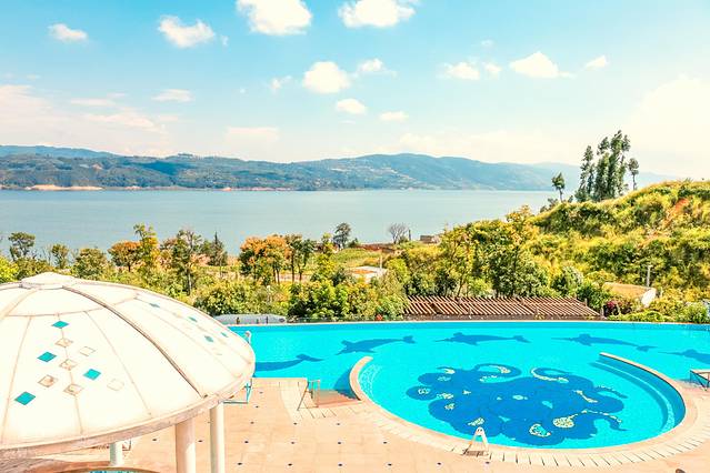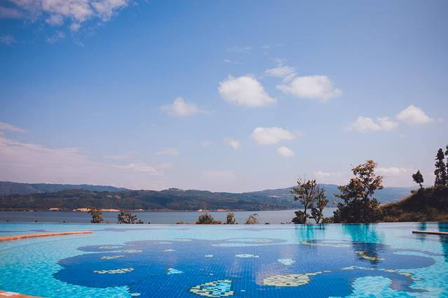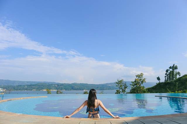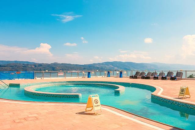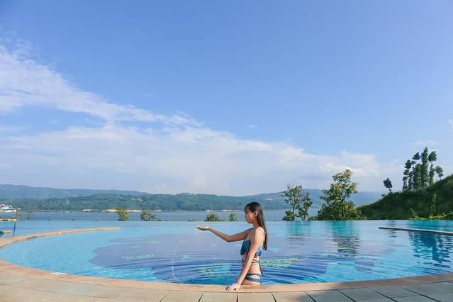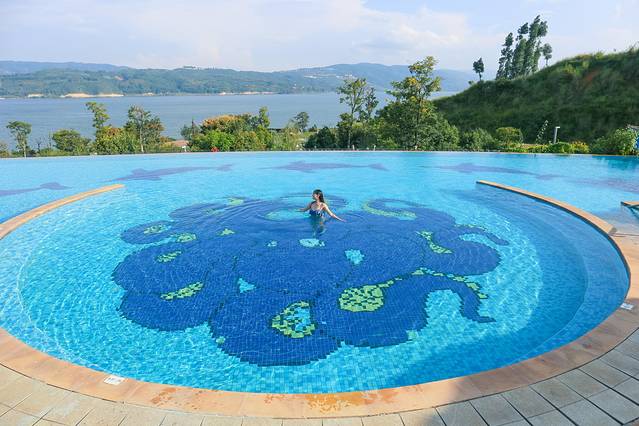 站在无边泳池的楼梯上俯瞰,对面的阳宗海和无边泳池景色交相辉映,迫不及待想下去开启拍照模式~!~