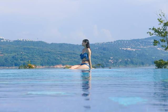 战战兢兢的坐在泳池边缘,就想拍个照骗,铝孩纸为了拍照真的拼了~