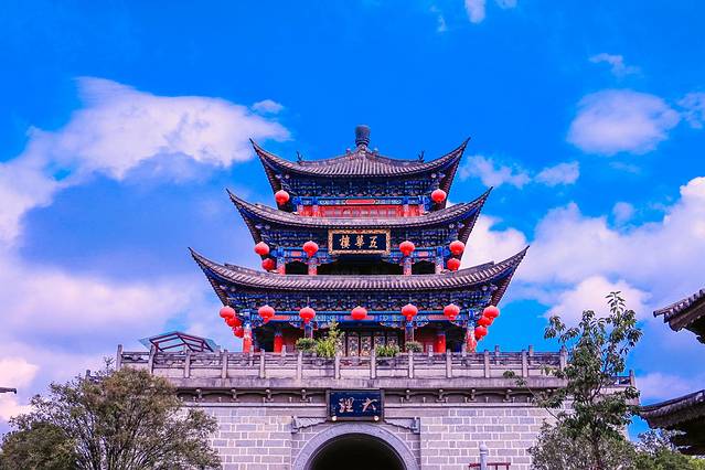 ③五华楼:五华楼是古城内最气派的建筑之一,也是最出名的必经之路,可以登楼远眺苍山、俯瞰古城区,尤其夜晚的五华楼华灯初上,非常漂亮。建议一定要趁着清早人不多的时候来,不然拍照的会很多哦~