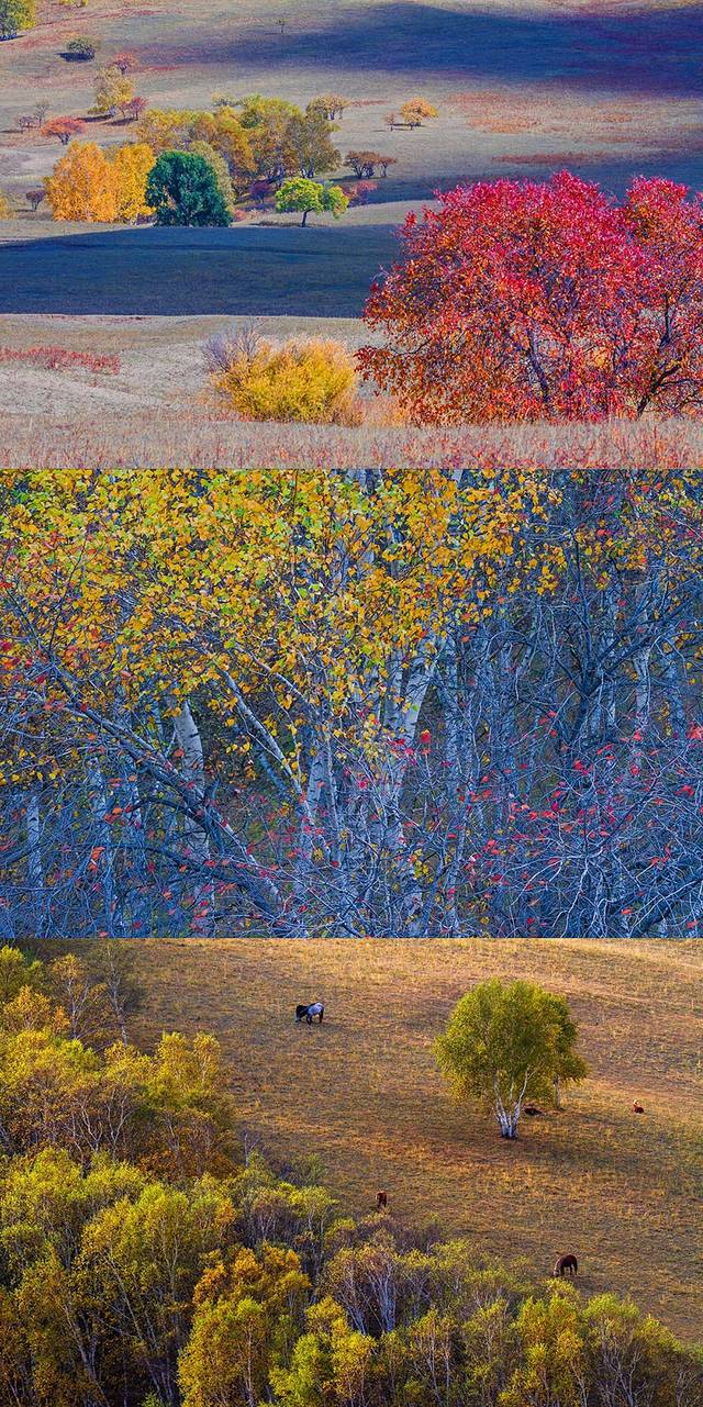五颜六色的草原上点缀着成群的牛羊,