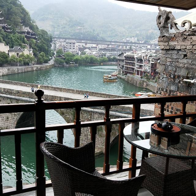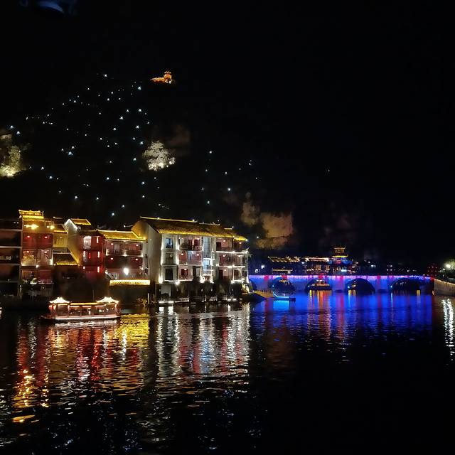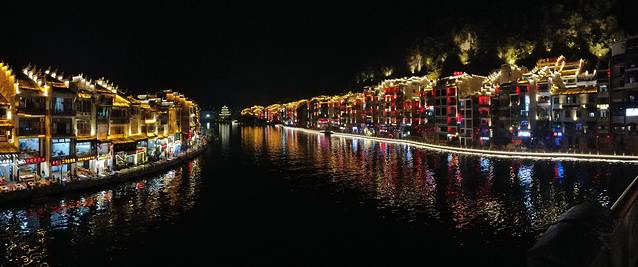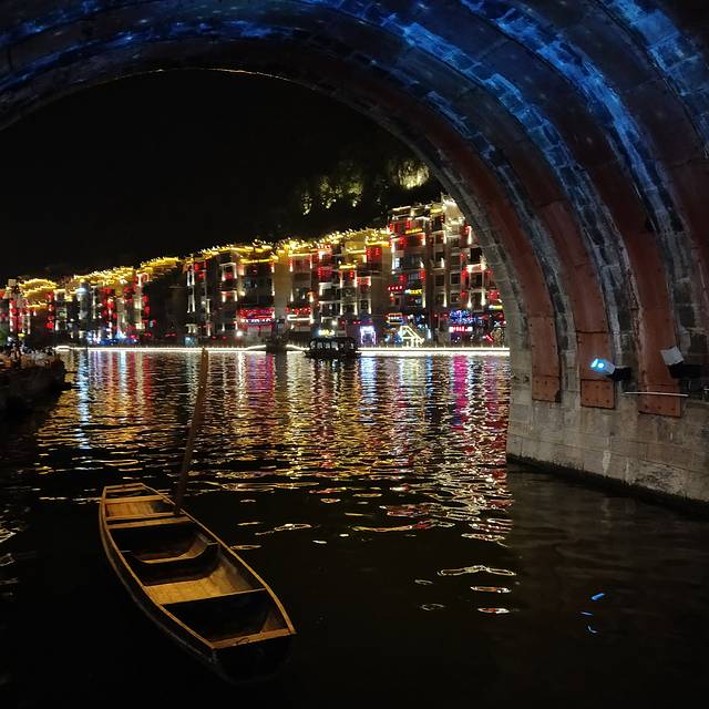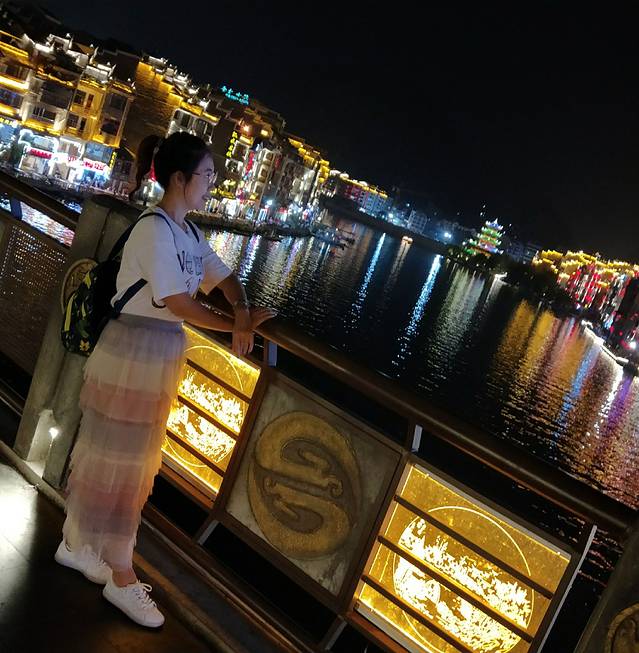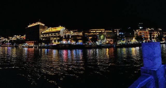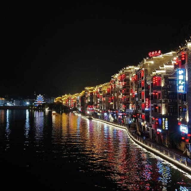 下山后大约下午4点,我们驱车去往下一站小七孔,从梵净山去小七孔大约6个小时的车程,所以我俩打算今晚走一半的路程住到凯里市,第二天再赶往小七孔。就在快到镇远的时候,老公突然有个想法,说镇远古城是个很不错的地方。晚上可以住在镇远观夜景。问我凯里的房间可不可以退。幸亏我定的是限时取消的,六点之前可以退房间。老公憨笑着说计划有误,早应该想到路过镇远的。不过一切都不晚,刚好来得及。我在车上便开始查找镇远古城的攻略,住宿。果不虚此行,初次见面给我的感觉和凤凰古城类似。进入古镇,眼前呈现的是一幅青砖黛瓦,古色古香,山水环抱的立体画卷。一侧是山一侧是水,水是舞阳河,山是石屏山。我定的客栈是在祝圣桥旁边。一个带阳台的河景房。入住后已是夜幕降临,漫步在古镇的青石板路上,悠闲舒适,爬山的疲惫顿时烟消云散。城内的街边是文艺小店,民族服饰,镇远美食。夜晚的镇远非常漂亮,河边的灯笼特别红亮,一串一串的灯笼挂在河边,河水倒影着灯笼,意境绵远悠长...……在舞阳河畔热乎乎的吃上一顿酸汤鱼,凉风习习,别提有多舒服了。深夜里酒吧好生热闹,在河畔的垂柳下,小哥哥弹着吉他,唱着沙哑的小情歌。三五好友喝着小酒(我的酒友们没来,我只能看着人家惬意的喝酒😂)……
