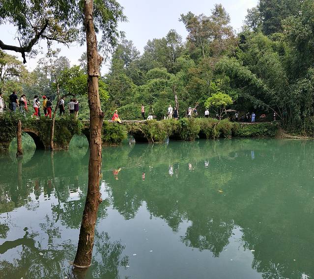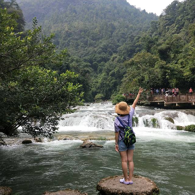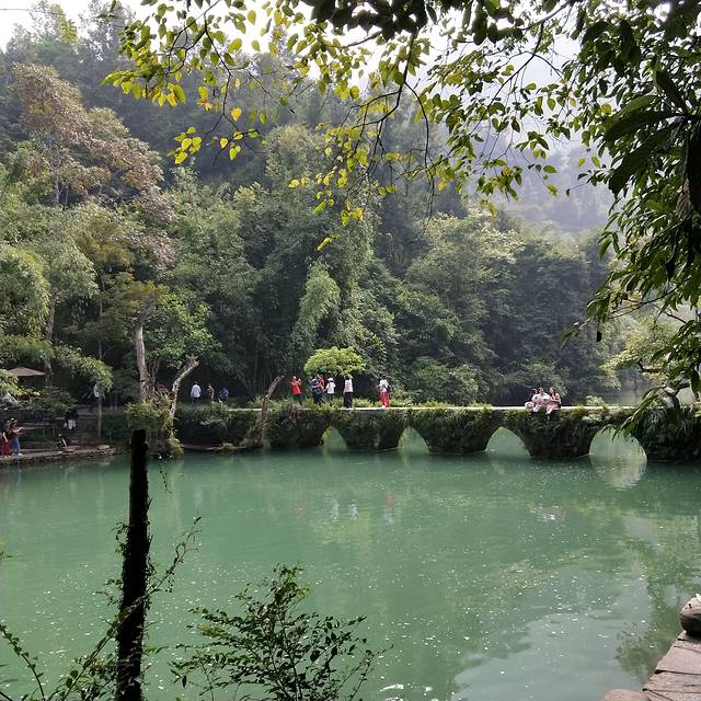 就这样漫步欣赏着瀑布美景,不知不觉中走到了小七孔桥下(小七孔因此得名),桥虽然算不上稀奇,但是桥下的碧水和两岸的古木拼凑出一副古色古香的山水写意画,让你如在画中,似在梦里。处处是风景,随手一拍都满是情调诗意。