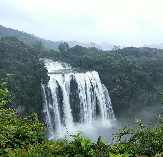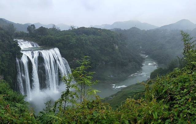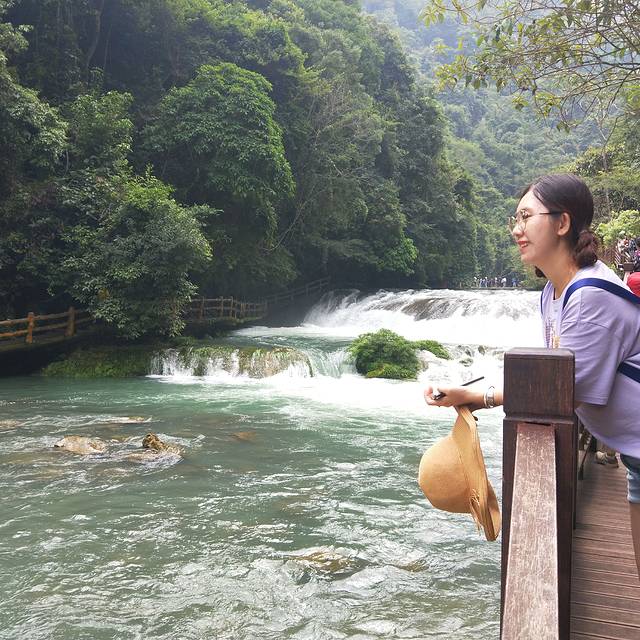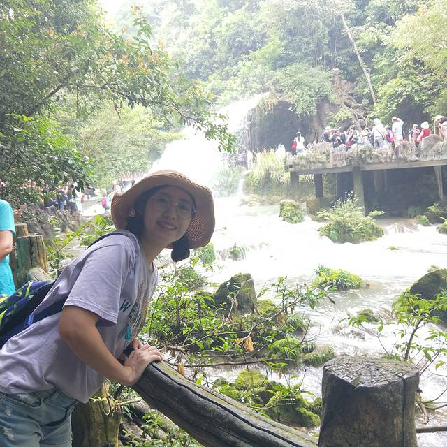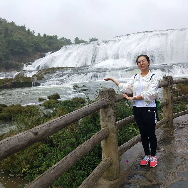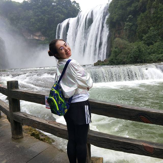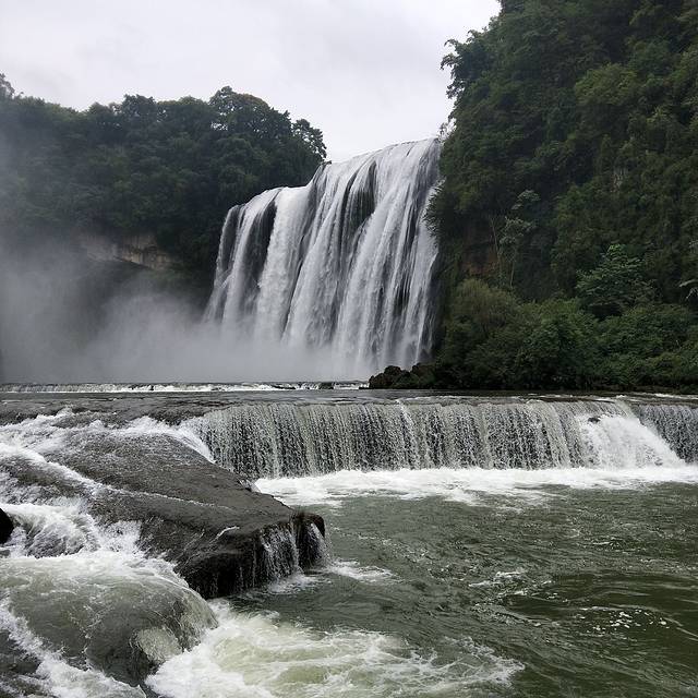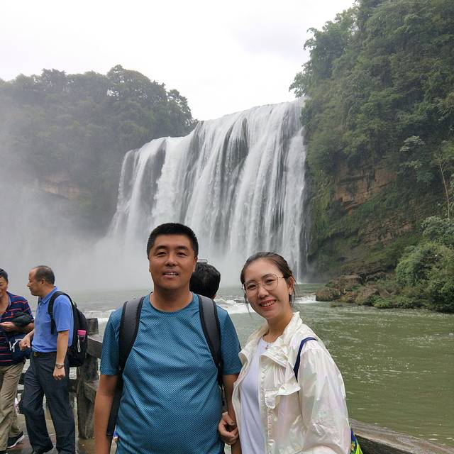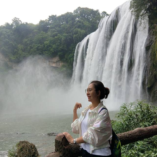 下一站是黄果树瀑布,去往黄果树瀑布可以选择在陡坡唐门口坐观光车十五分钟到达,也可以从陡坡塘景区步行穿行,大约40分钟。(步行穿行的最大好处是可以从高处直观的看到黄果树瀑布景区全貌)。所以我们选择步行,步行人的很少,山水中走走停停,很是惬意!当我们走一段路程后,听见水声哗哗,轰轰如雷的巨响,当年徐霞客在《徐霞客游记》中用包含深情的笔墨写道“瀑声震天,十里相闻”,想来用这句话来形容黄果树是再贴切不过了。我和老公说是不是大瀑布到了。果然眼睛穿过树林,壮美的黄果树大瀑布出现在眼跟前,真是太壮观了,给我第一感觉独一无二的震撼,震撼到无法用言语形容,真不愧是中华第一、亚洲第一的大瀑布。从天而降,声音震耳,水气弥漫,只有亲眼看见才能了解是何等壮阔。无论从那个方向观赏(前后左右里外上下)都是相当壮美!
