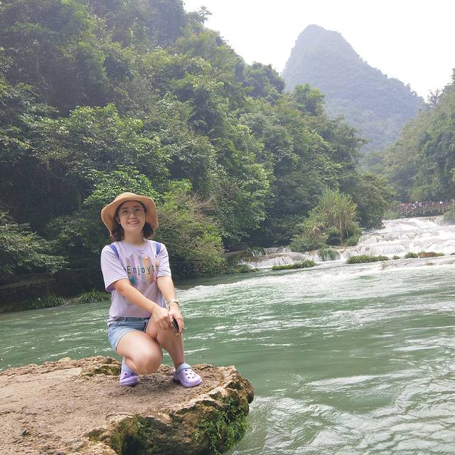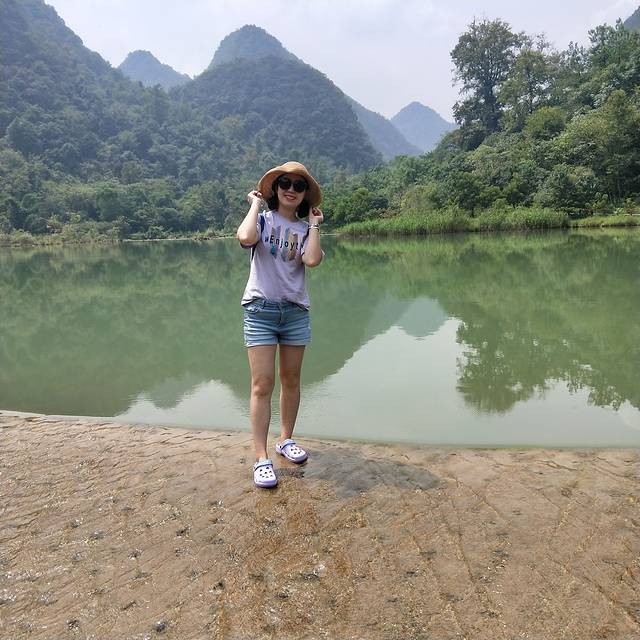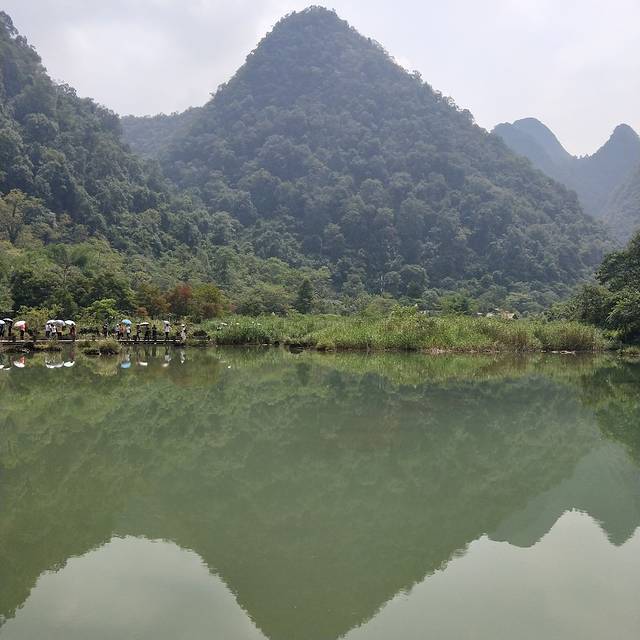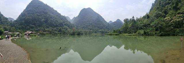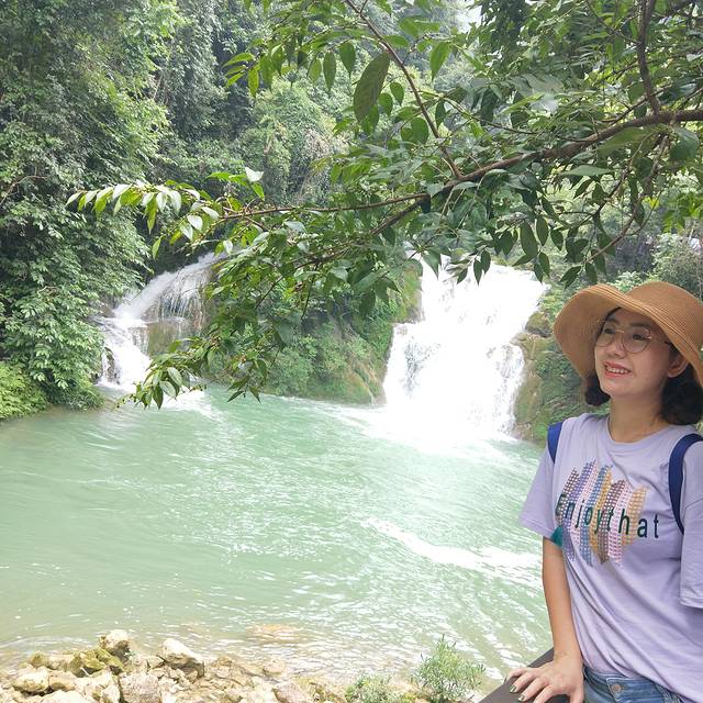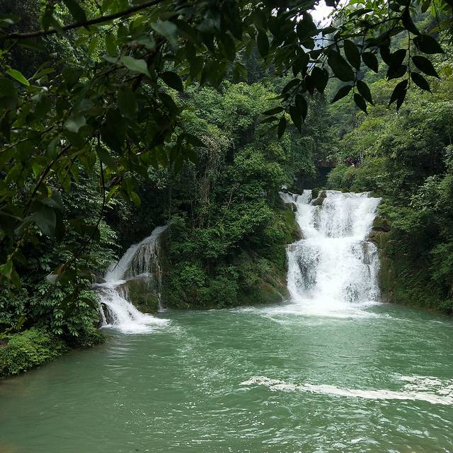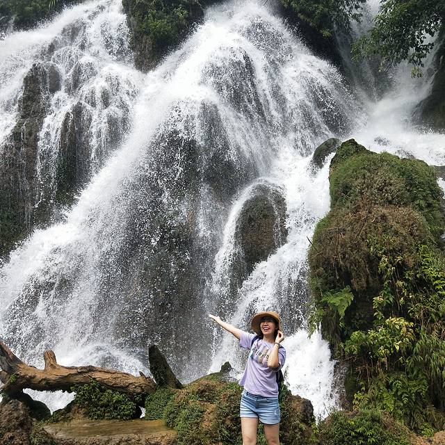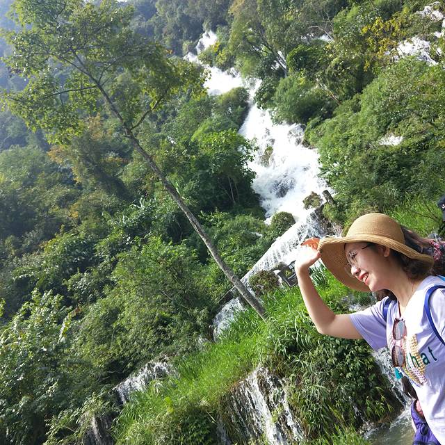 从溶洞出来很快就到达下一个景点,翠谷瀑布。翠谷瀑布悬于群山之中,水顺山倾泻而下。像一条白练从山腰垂落到山脚下。翠谷瀑布前面有个上几定湖,平静如镜面的湖水倒影着苍翠欲滴得群山,仿佛一幅静止的画面。