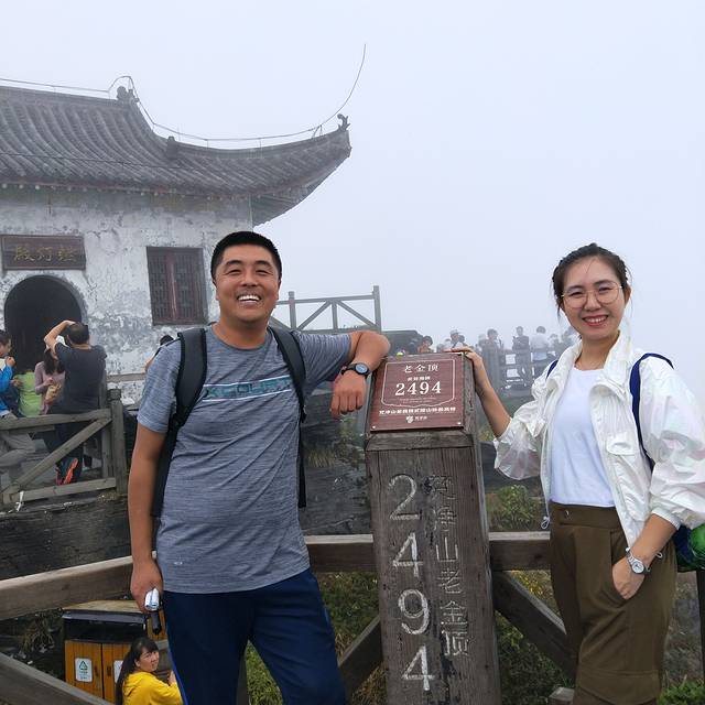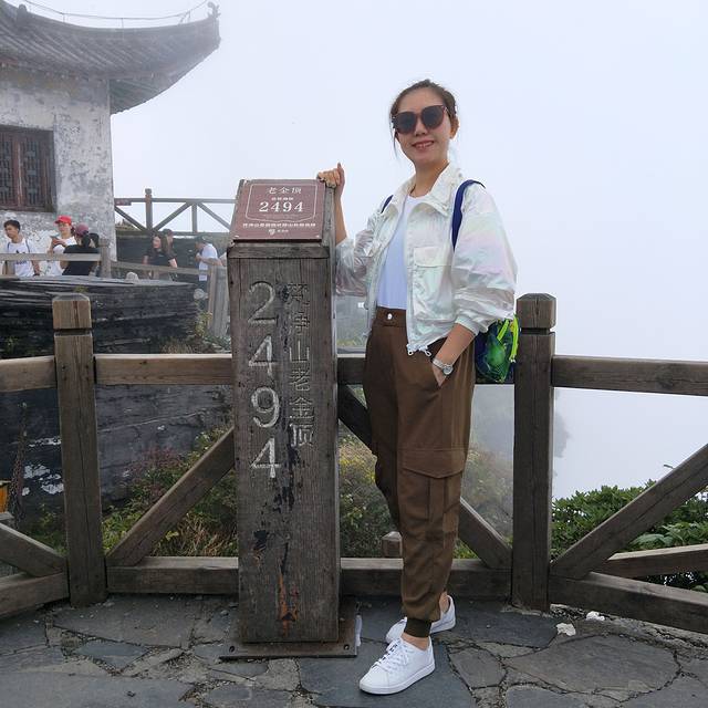 因为雾气还没有散开,还是一片白。所以在蘑菇石的观景平台上等着雾散开。好多报团的游客来不及等,很遗憾的爬老金顶或下山去了。我们是自由行,可以随意的支配时间。果然不出半个小时,在时隐时现的雾气中看到了苍山连绵,云海翻腾。真的是太美了。若隐若现,恍如置身于仙境当中。