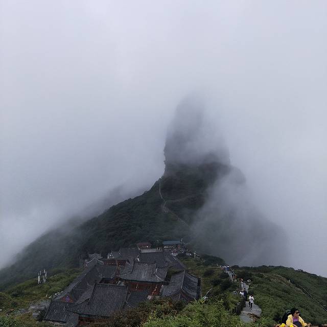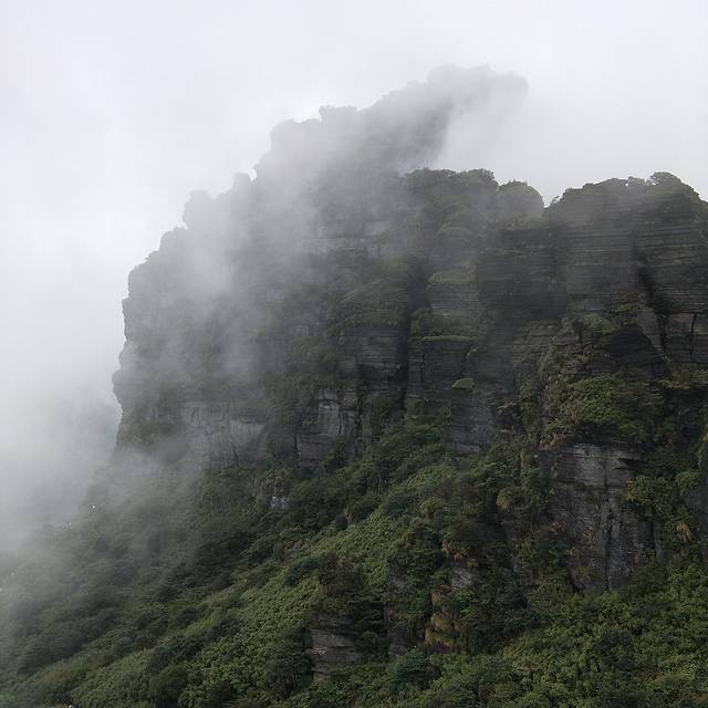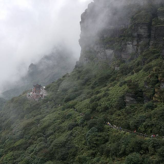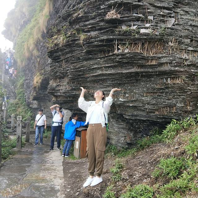 大约几分钟,雾气又开始弥漫,我们便去爬老金顶,这是一条很惊险的山路,笔直峭壁尽靠一根铁链拉着。堪比华山的险。体验这个过程很是刺激,爬到老金顶依然是白雾弥漫,途中偶尔会有雾气散开的一瞬间。可以让我在云雾缭绕中欣赏到山势雄伟,坡陡谷深的美景!去往老金定的途中有一个崖壁叫般若泉,牌子上写着喝此仙水,可以化度消灾。我便孜孜不倦的蹲在那里接那一滴一滴的泉水。在老金顶逗留不久后开始下山。我还是不死心,想继续等着雾气散开,如此美景,真心没有欣赏够。所以我们返回蘑菇石,继续等着观景,正当我返回去的时候正好是雾气散开的一瞬间(真是喝了仙水的人啊,运气这么好🤗)曾经著名的诗人王心鉴写到“近山褪俗念,唯有竹声暄,栖心皈净土,推云步梵天。禅雾入幽谷,佛光上苍岩。海内遁道者,多来修仙缘。"即是说明了梵净山风光秀丽让人忘却尘世烦恼的魅力景色!