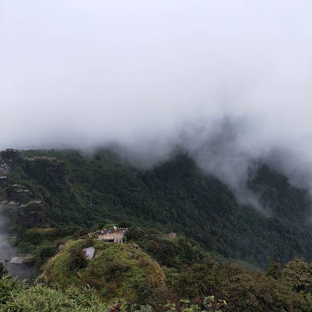 观光车送到索道口,坐索道大约20顿分钟可以开始爬山。本来坐缆车这一段也是一翻美景。只可惜没赶上好天气。雾太大,四周白茫茫一片,什么都看不见,只能期待上山顶后大雾会散。下缆车后是一个大平台,从这里开始顺着木质栈道开始爬升!第一站蘑菇石,这里的台阶还比较好走。慢慢走45分钟可以到达。蘑菇石是俩块巨石相错叠,危而不落。是梵净山的标志。据说这块石头在风霜雨雪中屹立了十亿年了。