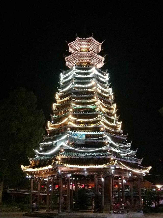 返回侗寨已经是夜幕降临,这里是侗族的居住地。沿着石板路走进侗寨,俩旁错落有致的分布着典型的侗族吊脚楼。侗寨最具特色的建筑物就是–鼓楼。夜幕之下,星火闪耀,古朴的钟楼明艳动人。我们没赶上篝火晚会,便早早回去休息了。