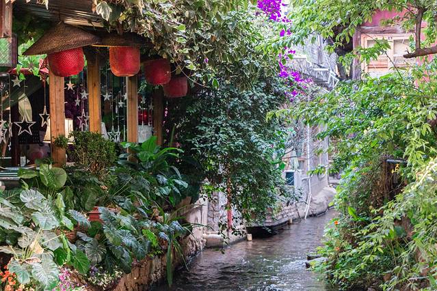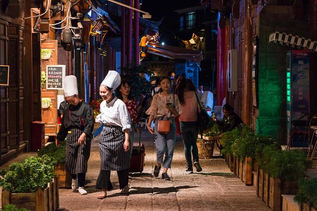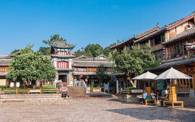 束河优点江南水乡的感觉,一条小河从古镇边上流过,引进来的水在古镇最中心的位置汇聚了一个大水塘,周围一圈是酒吧、饭店,白天也是整个束河最热闹的地方。
