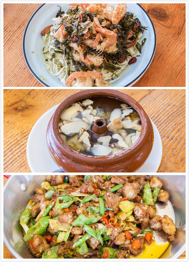 店里的菜品很丰富,山椒鸡、秘制雪山鱼、普洱茶大虾都是味道很赞的菜品,让我们两个四川人吃得赞不绝口;而松茸菌汽锅鸡更是极品,可以说在外地吃不到云南菌子的这个鲜。