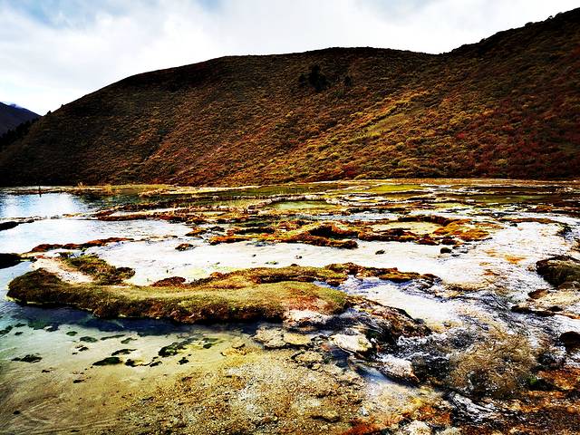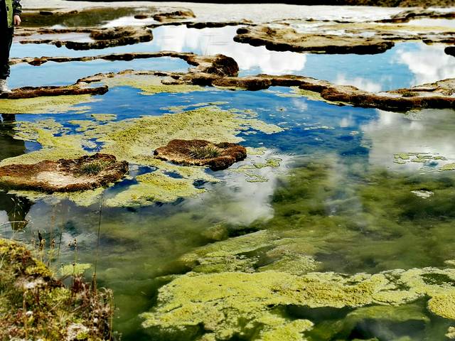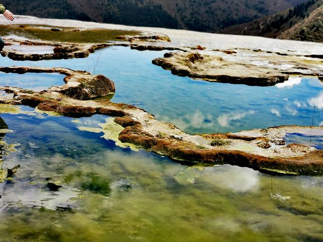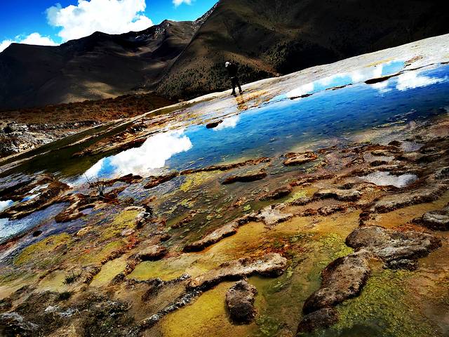泉华滩因一种含有大量化学物质的泉水在地表产生化学沉淀而成,长达900多米,宽100余米,依山而下形成8个泉华阶地。每个阶地上有十几个大小不同、形态各异的五色彩池,水深40-70厘米,彩池里水草相依,石花点点,疑为瑶池降临人间。