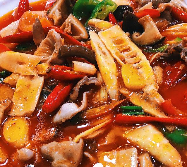 泡椒和藤椒的混合,竹笋和郡肝儿在泡椒酸辣的催化下双脆十足。